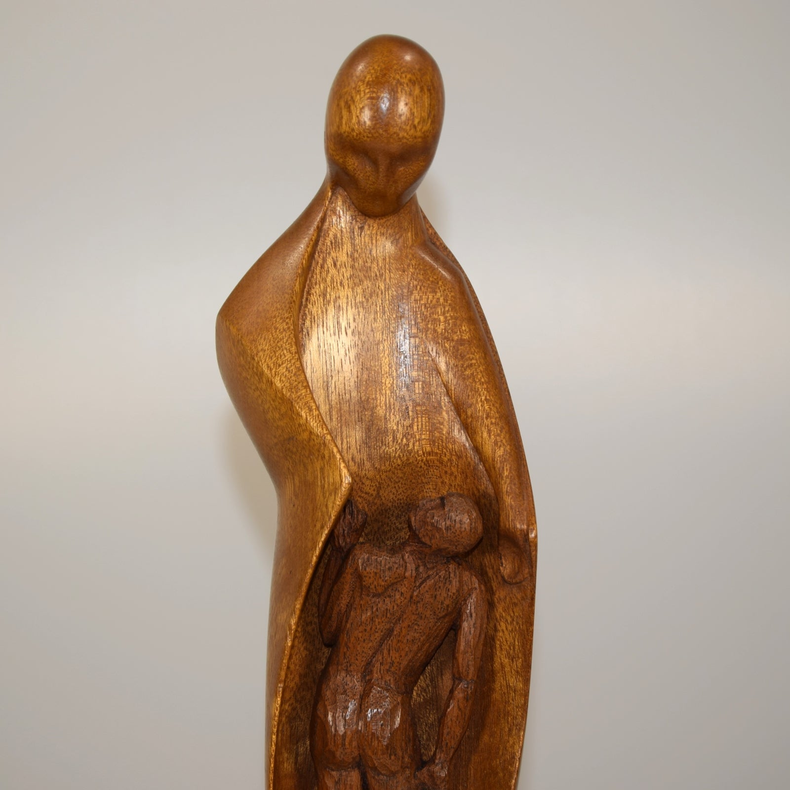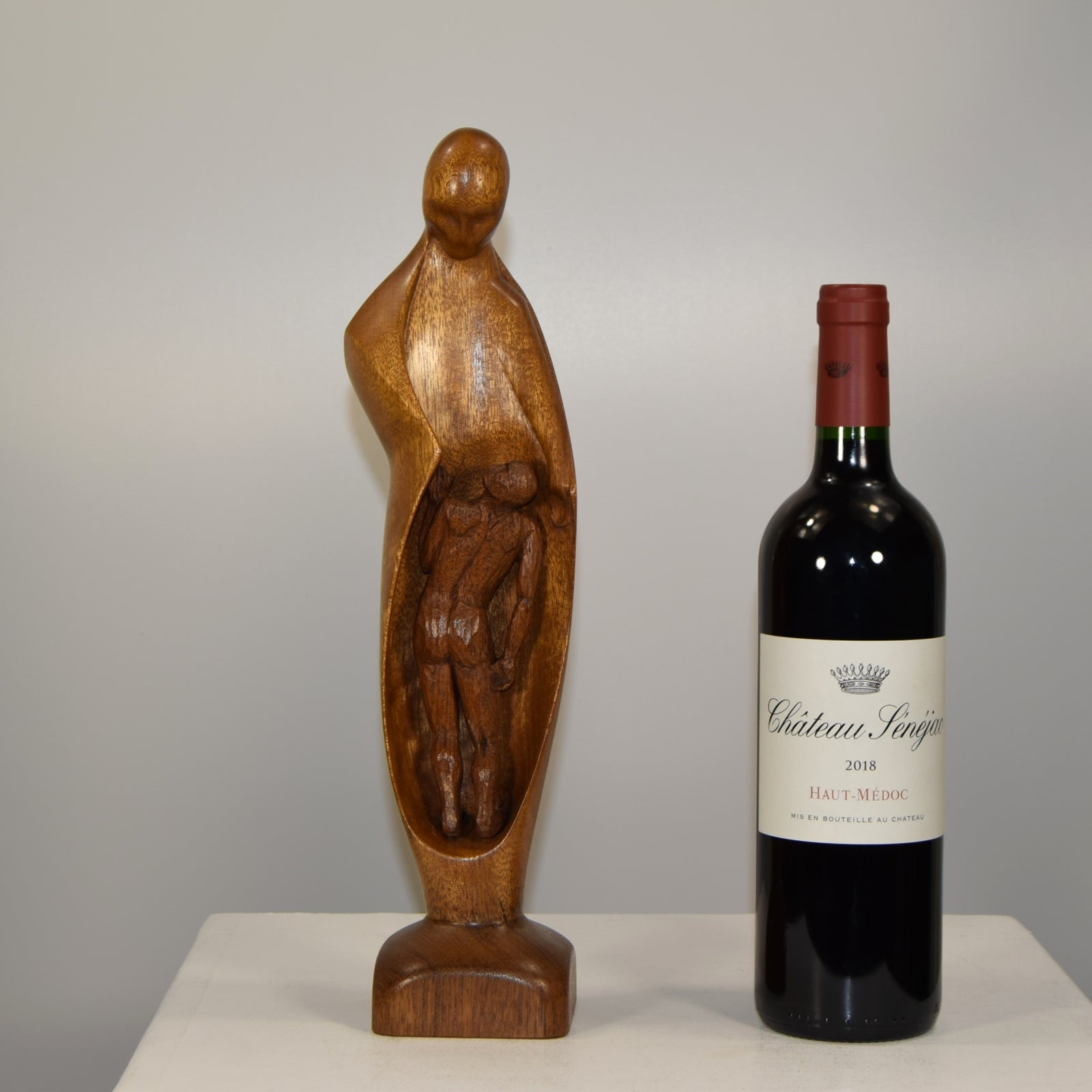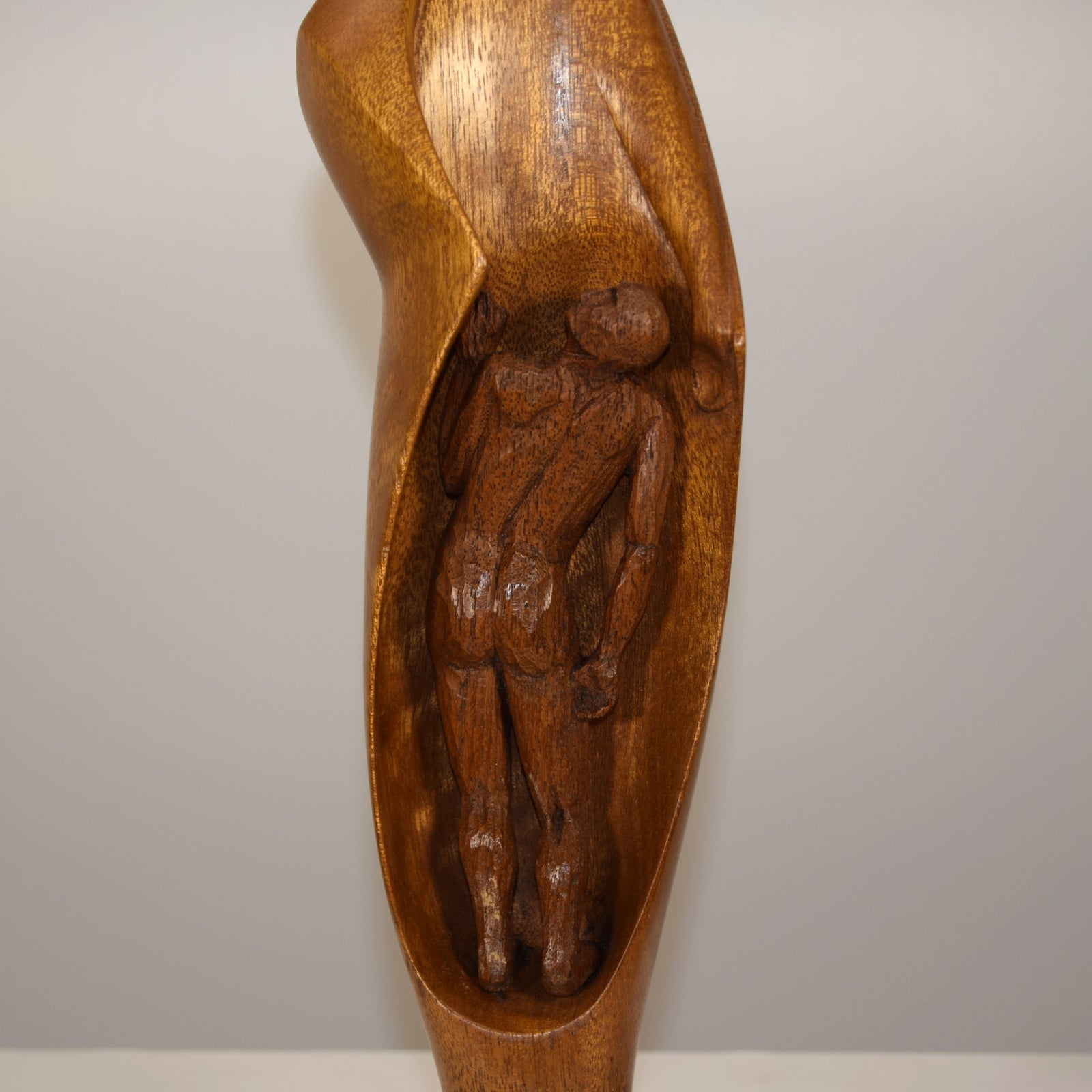 This piece is an excellent example of Mid Twentieth Century Scandinavian design. It has been exquisitely hand carved in mixed woods with the main female figure depicted in Teak and the male figure in Sapele.