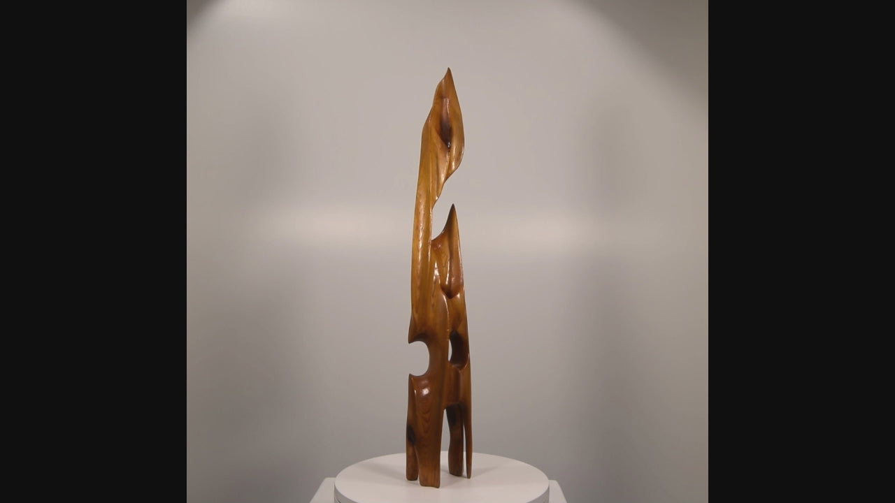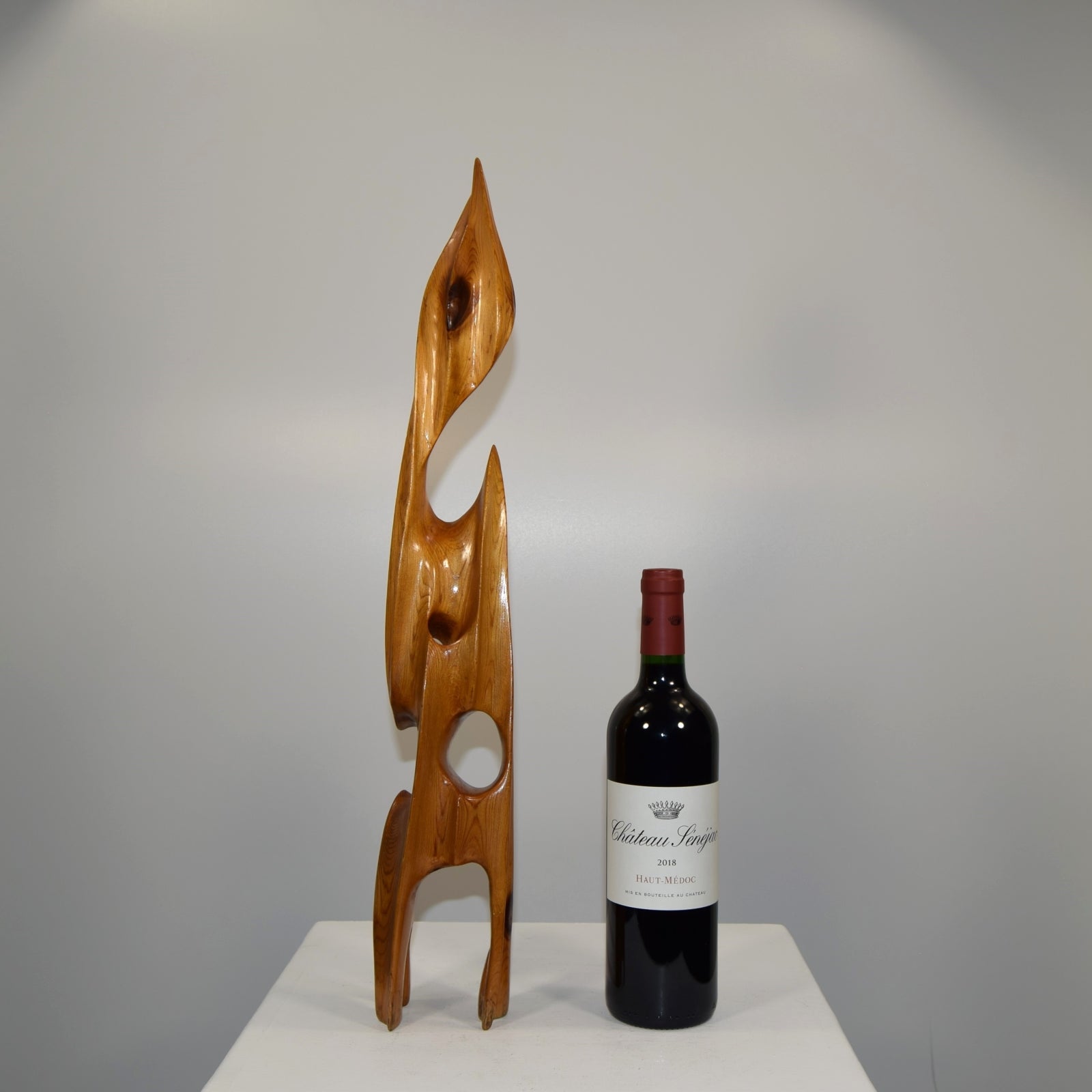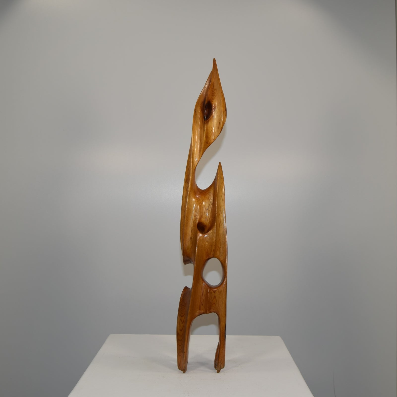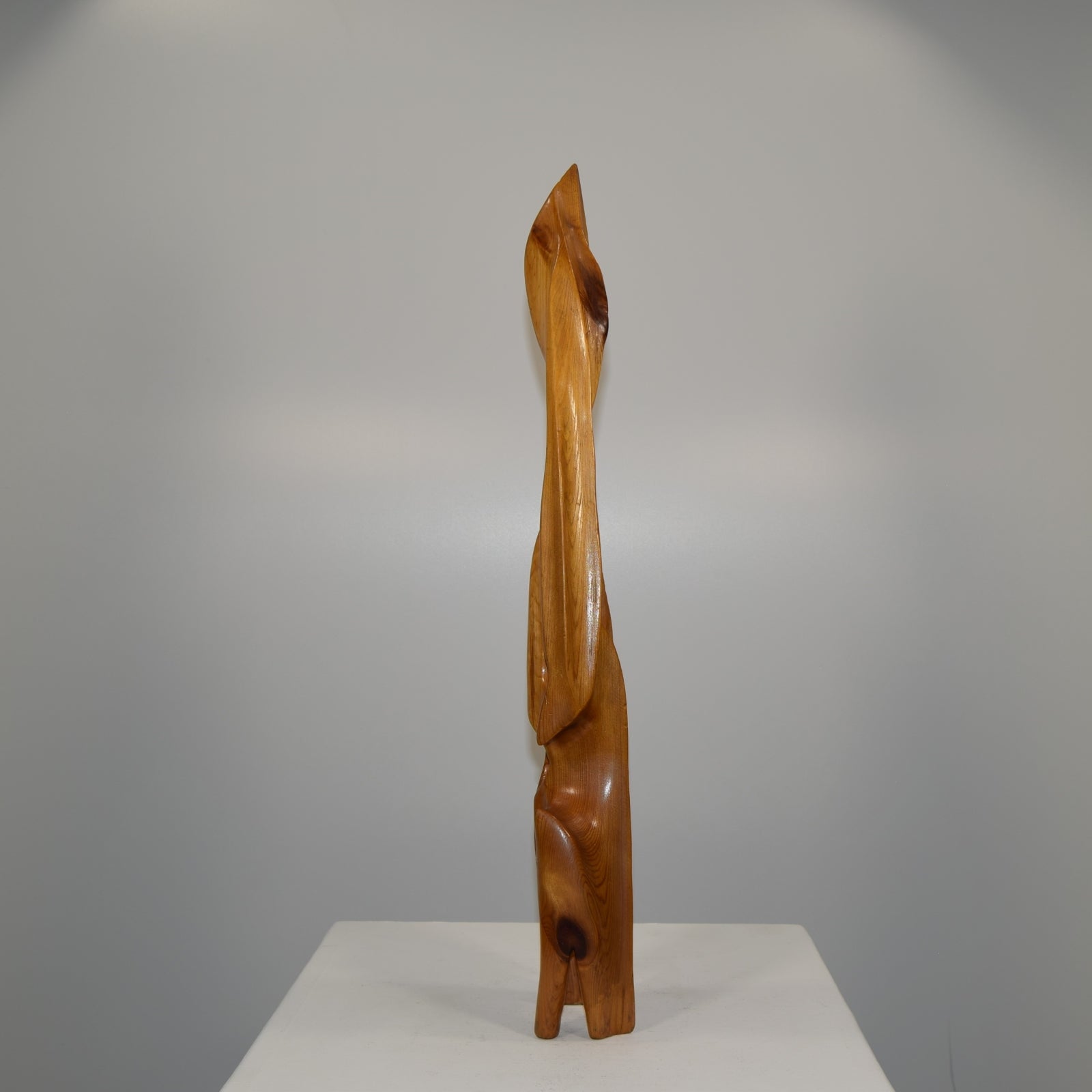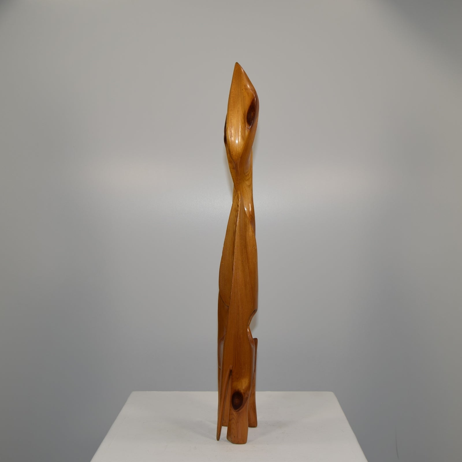 This impressive hand carved abstract form has strong grain lines of Pitch Pine and is a classic representation of 1960s when this was created. The sculpture is finished in a high gloss varnish which, together with the Pitch Pine are synonymous with the period . Sadly, the piece is not signed so the Artist remains unknown, but it would enhance any modern interior setting.