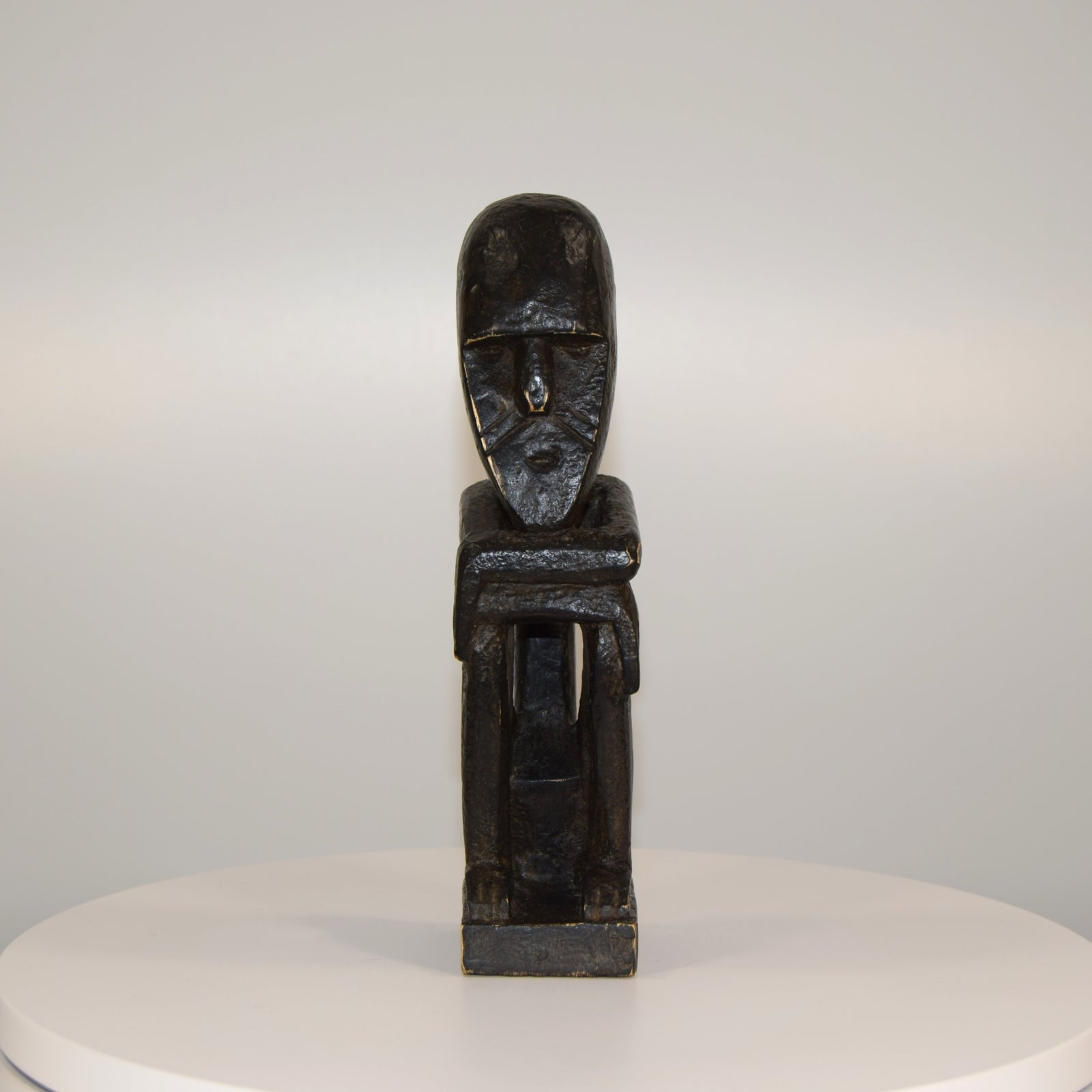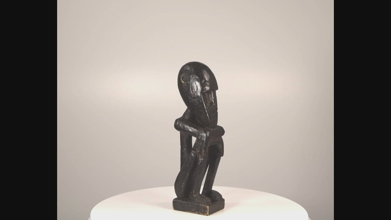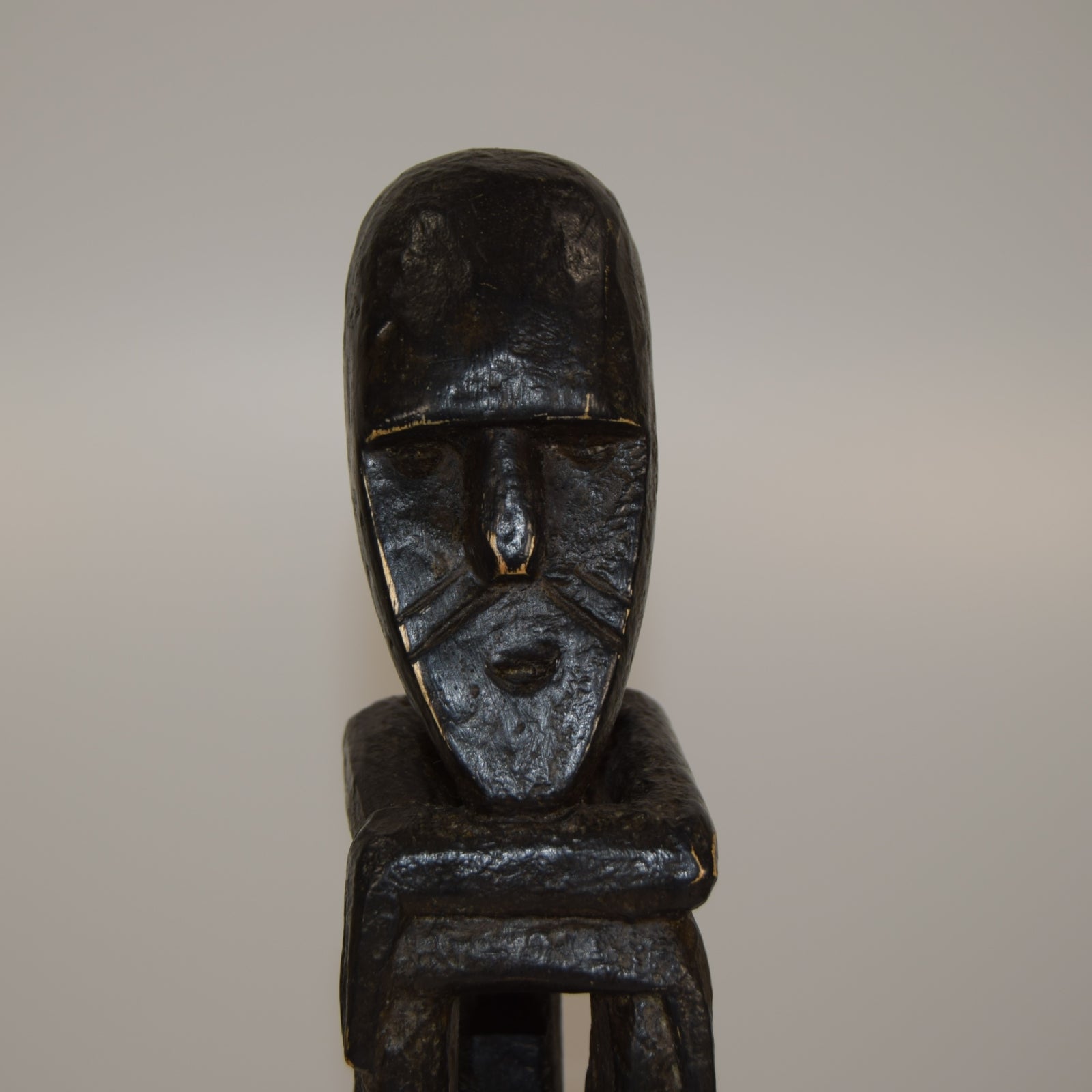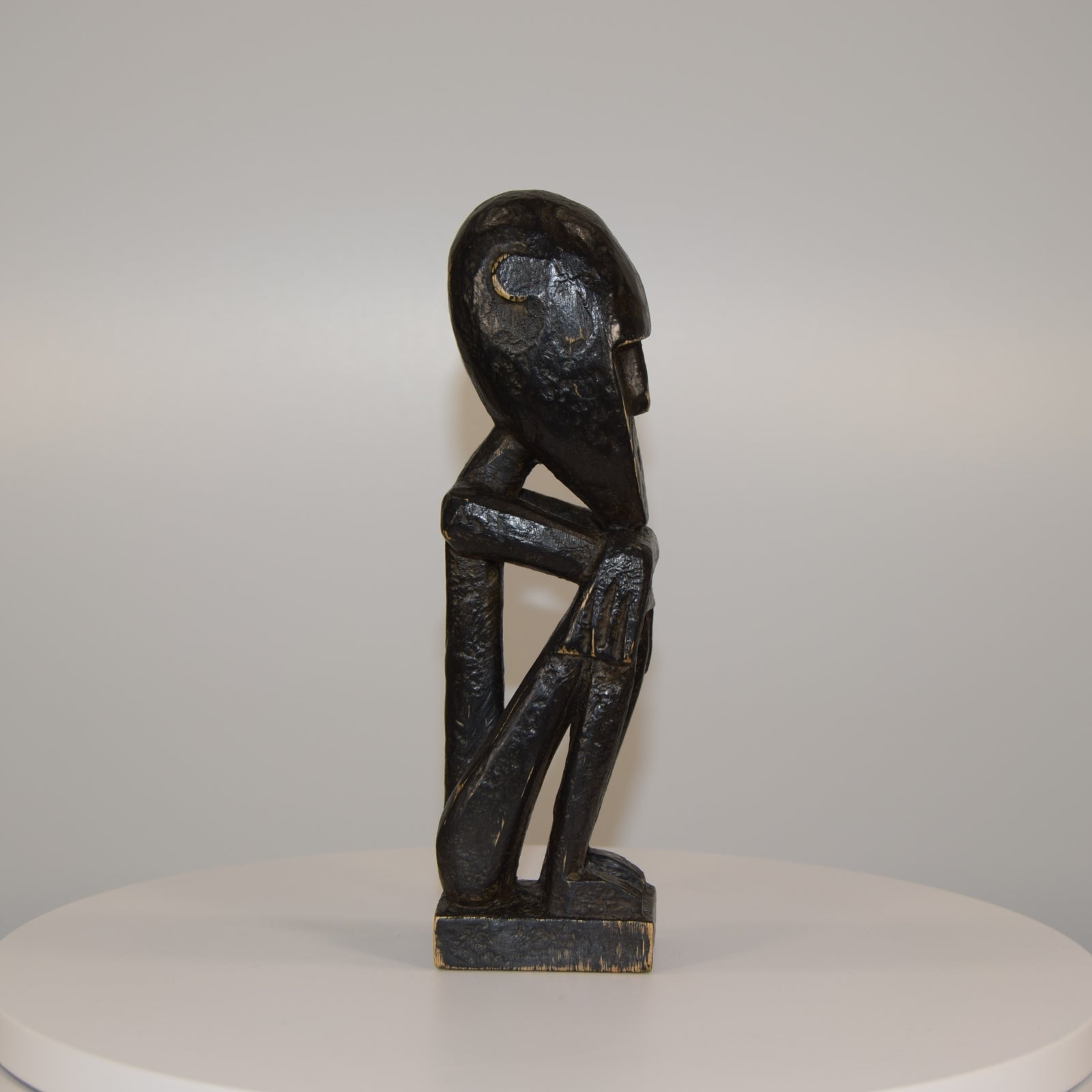 This genuine Mid Twentieth Century African Figure is hand carved from a very light wood and then finished with a black wax. I believe the wood could be Koto from West Africa and from the design the piece is possibly Kota (Bakota) which originates from Gabon West Africa. We are not experts in African sculpture, but we do know the lines and form of this piece has a real presence.
