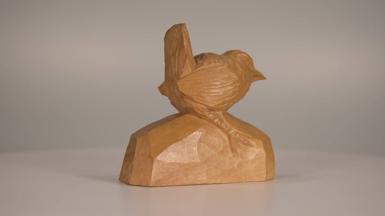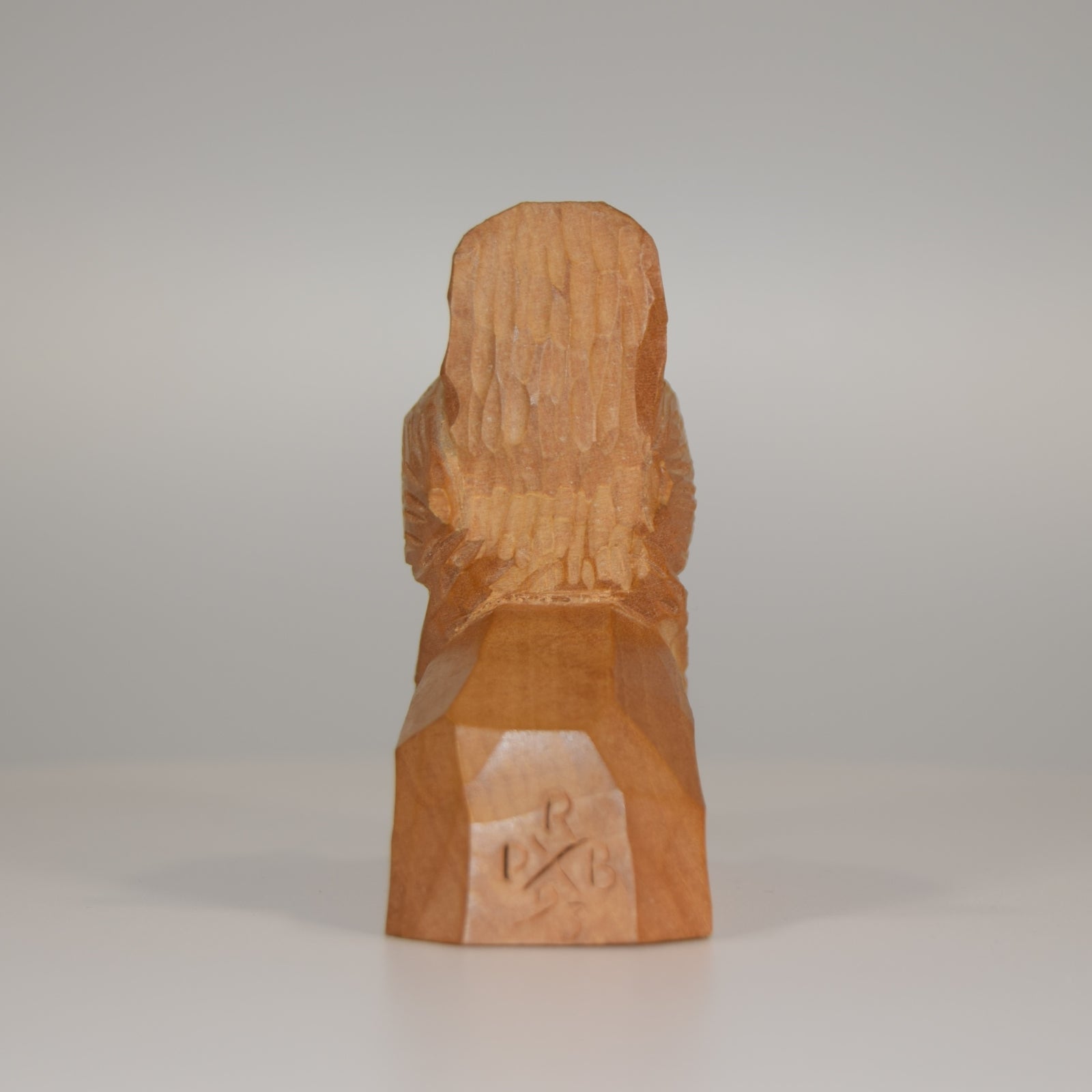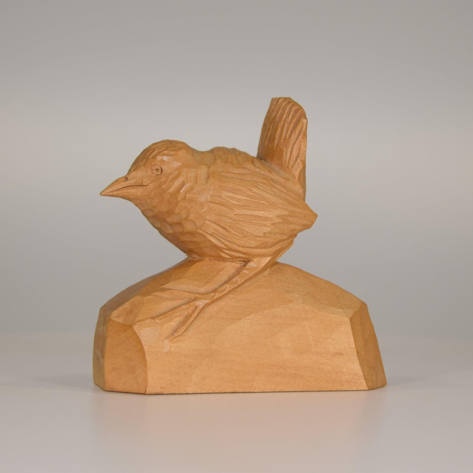 This wonderfully executed hand carved Life Size sculpture of a Wren in Lime Wood is by the respected Artist Peter Boex. Peter has captured the alert energy of this proud little bird which he has enhanced with a wonderful tactile surface which makes this piece a joy to look at and to hold in your hand. This piece has the Artist's chiselled monogram and the date '93' for 1993 and still retains it's original label on the underside.