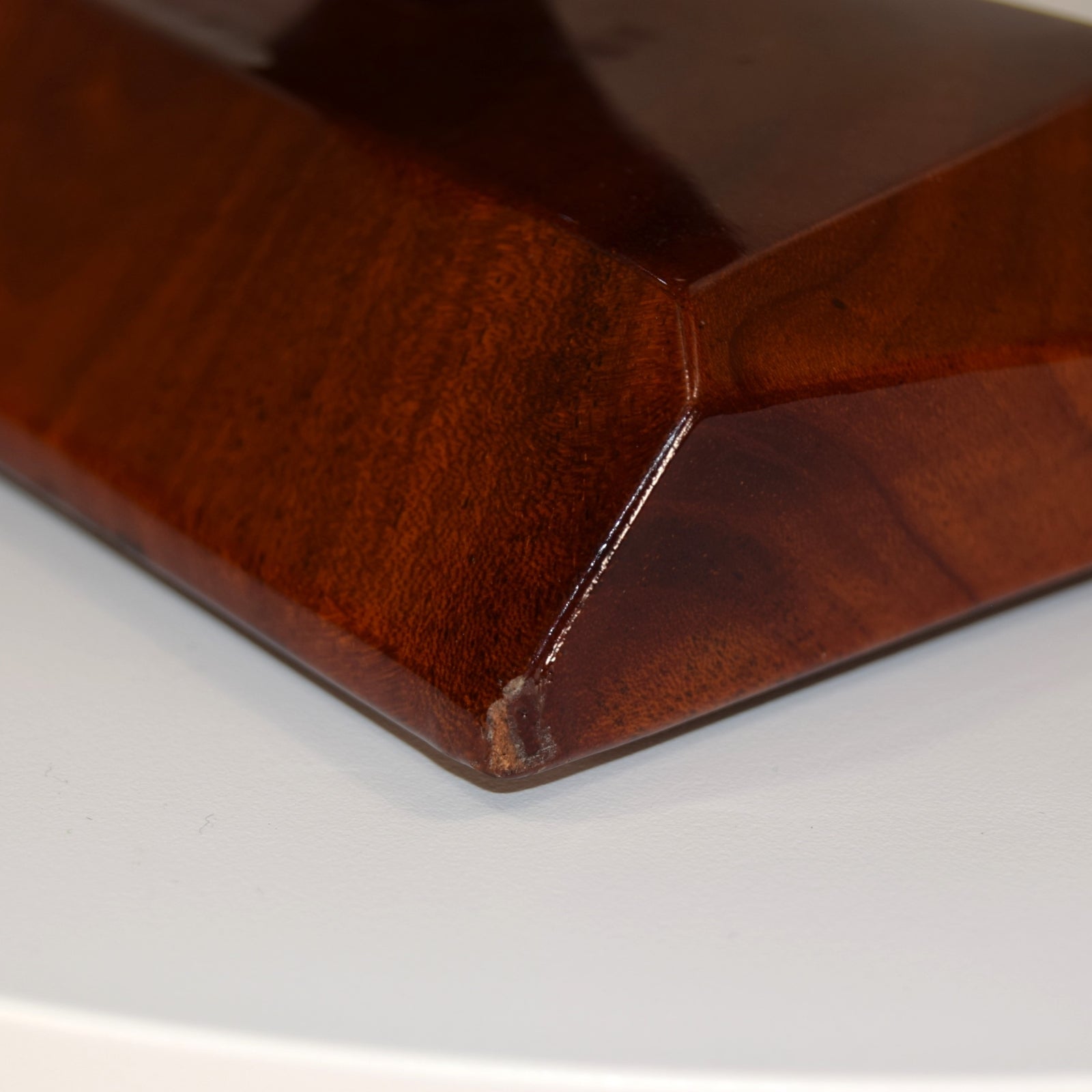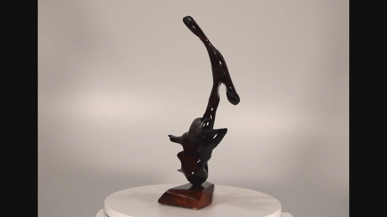 This is a naturally formed and beautifully enhanced Mahogany Abstract Sculpture by the renowned Barbadian Artist Reggie Metford. The piece is finished with Reggie's unique sanding and high gloss process which extenuates the sinuous lines. There is one tiny scuff to the corner of the plinth but this is very minor.