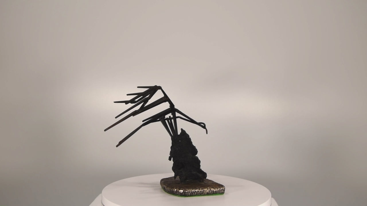 This is a pocket size power house of a sculpture with the Eagle being made with welded nails which in turn has been welded to a free form molten steel mount. The shadows this piece make with a raking light are outstanding.